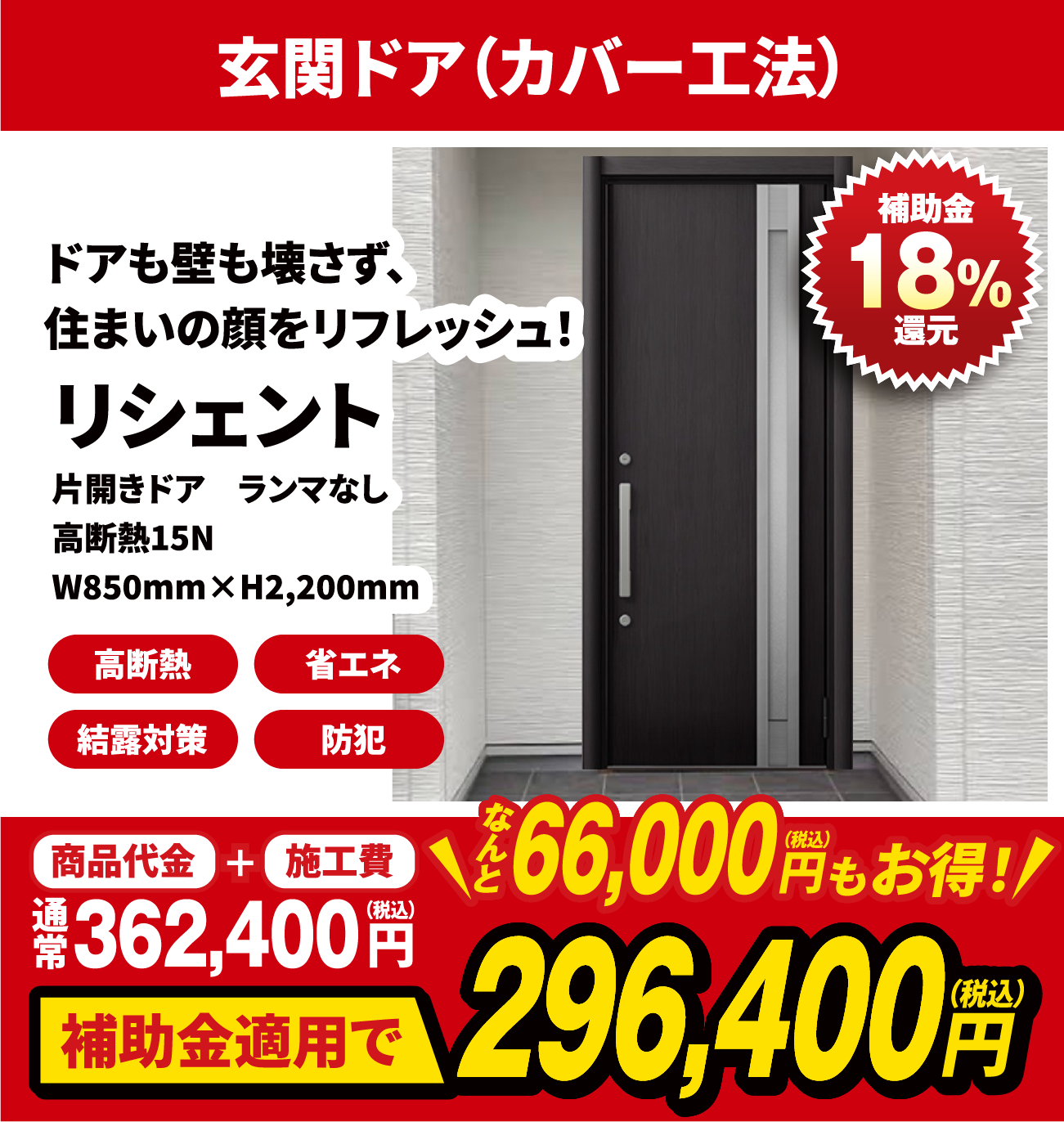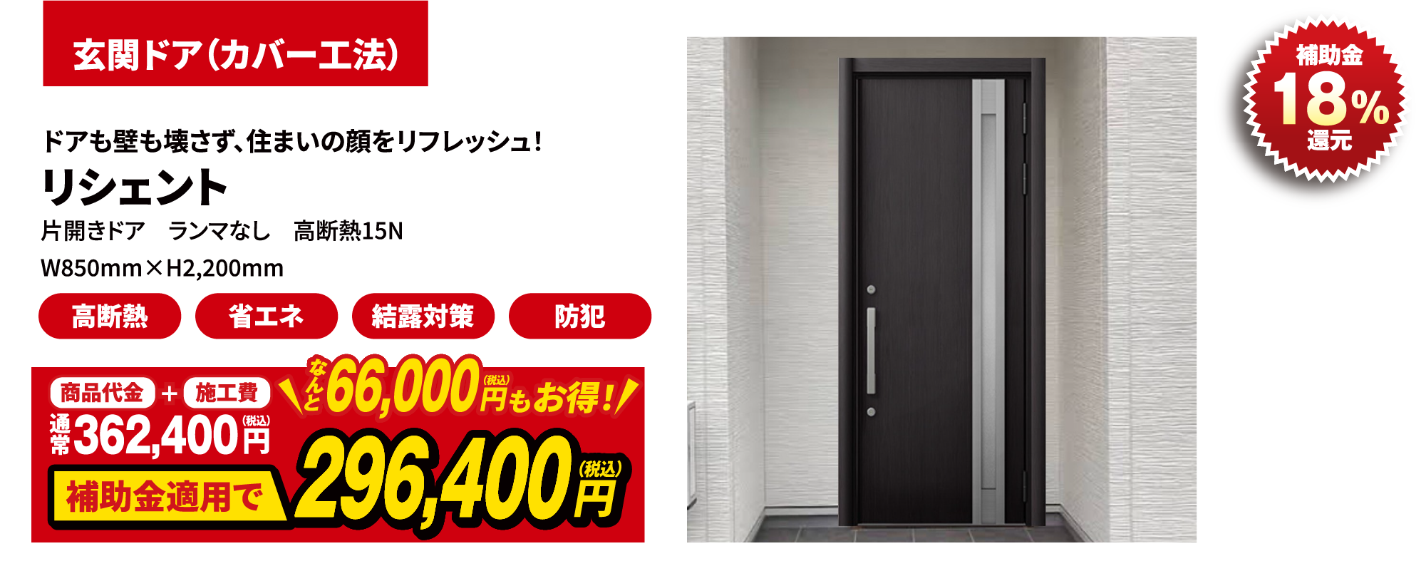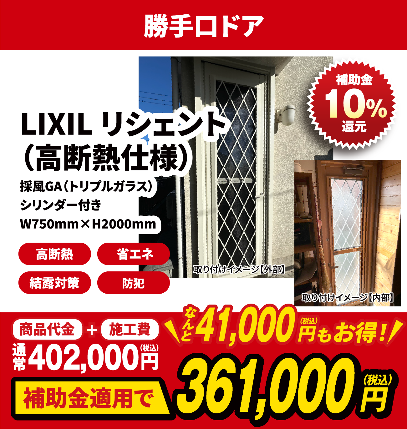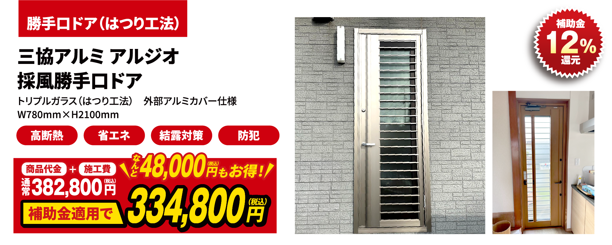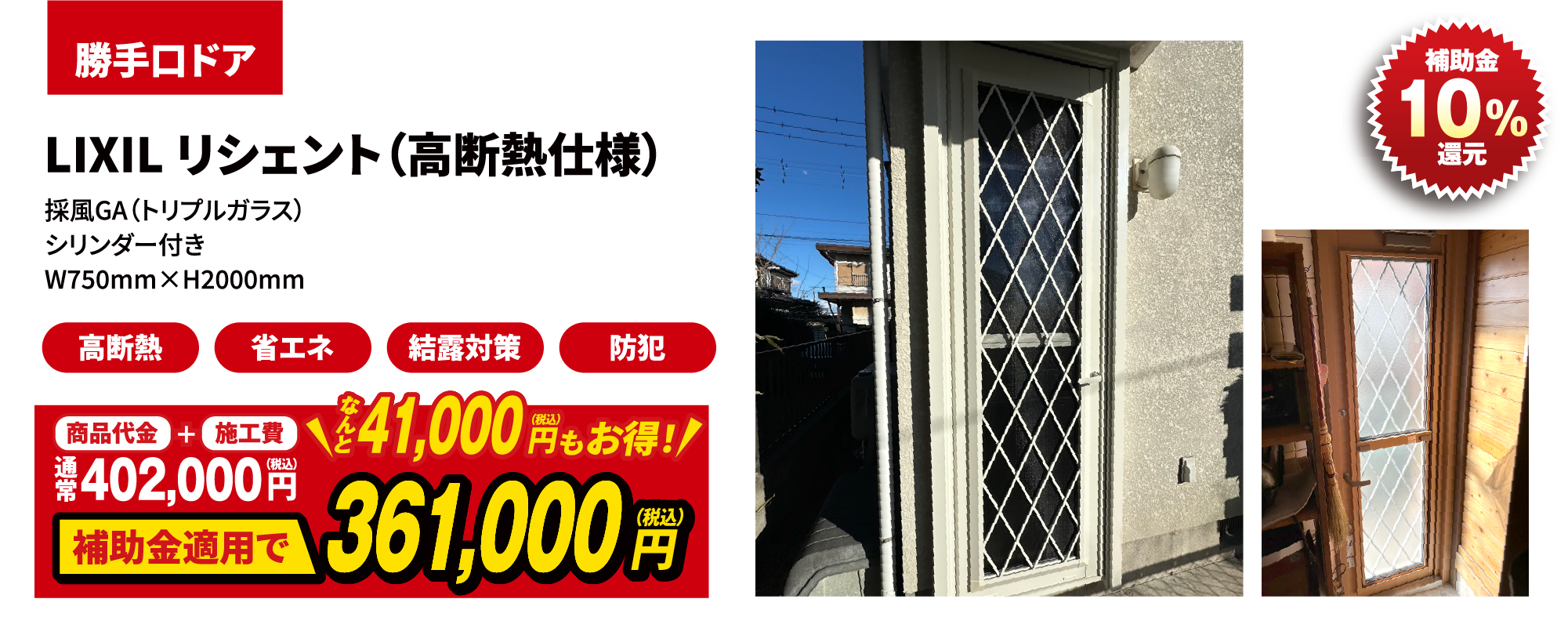 窓の改修と同一契約内で断熱性能の高いドアに改修する場合に限り補助の対象とします。